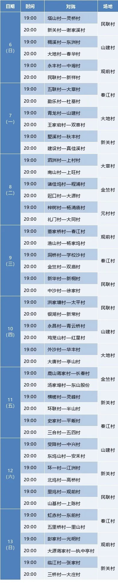 Kompetisi diadakan di sembilan zona kompetisi: Desa Minlian di Dongzhou Subdistrict; Desa Dadi, Desa Jinzhu, dan Desa Guanqian (Zhougongwu) di kecerdasan Yinhu; Desa Chunjiang dan Desa Shanjian di subdistrict Chunjiang; Desa Yuan di kota Xindeng; Aula Bola Basket Kota Changlv; dan desa Xingan di kota Dayuan . Tahun ini, bahkan lebih banyak orang akan dapat menonton pertandingan menarik tepat di depan pintu mereka.